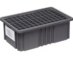 Protect your electronic components from typical electromagnetic interference (EMI), electrostatic or induced fields with these molded, carbon-filled, copolymer polypropylene dividable grid containers. Surface resistivity is less than 105 Ohms-per square. The conductive material provides a barrier which these fields cannot penetrate and prevents the build-up of electrostatic charge. Containers, dividers and covers are permanently conductive and are unaffected by washing with normal cleaners. Containers have a load capacity of 100 lbs. Dividers available to customize your box into compartments at 1-1/8" intervals and snap covers protect contents from dust or damage. Be sure all units are properly grounded according to your use. Color is Black.