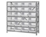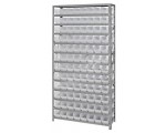 Economical small parts storage systems keep parts easily accessible. Open hopper front bins with label area provide fast access to stored items. This all-in-one unit is easy to clean and will not rust or corrode. Heavy-duty, high grade shelving offers a 400 lb. capacity per shelf. 36” wide shelving has a smooth powder coat finish. Bins are available in Blue, Yellow, Red, Green, Ivory or Black.